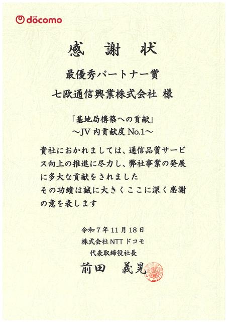 2025年11月18日にNTTドコモ様主催の「ビジネスパートナー様への感謝の集い」が開催され、見事に七欧通信興業が「最優秀パートナー賞~コムシスJV貢献度No.1~」を受賞いたしました。
